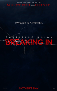 Story: Gabrielle Union stars as a woman who will stop at nothing to rescue her two children being held hostage in a house designed with impenetrable security. No trap, no trick and especially no man inside can match a mother with a mission when she is determined on Breaking In. Source: Breakinginmovie.com.