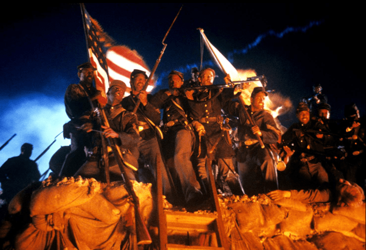 The 54th leads the charge on the fort, suffering serious losses. As night falls, the regiment is pinned down against the walls of the fort. Attempting to encourage his men forward, Shaw is killed by numerous gunshots. Trip, despite his previous assertion that he would not do it, lifts the flag to rally the soldiers to continue, but he too is shot dead. Forbes and Rawlins take charge, and the soldiers break through the fort’s defenses. Seemingly on the brink of victory, Forbes, Rawlins, Searles, Sharts, and the two Color Sergeants are fired upon by Confederate artillery. The morning after the battle, the beach is littered with the bodies of both black and white Union soldiers. The Confederate flag is raised over the fort and the dead Union soldiers are buried in a mass communal grave, with Shaw and Trip’s bodies next to each other. Source: Wikipedia; IMDB; The Ace Black Blog.