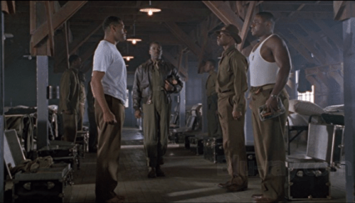 Cast: Laurence Fishburne (Capt. Hannibal “Iowa” Lee, Jr.), Allen Payne (Cadet Walter Peoples), Malcolm-Jamal Warner (Lt. Leroy Cappy), Courtney B. Vance (2ndLt. Glenn), Andre Braugher (Col. Benjamin O. Davis Jr.), Christopher McDonald (Maj. Sherman Joy), Daniel Hugh Kelly (Col. Rogers), John Lithgow (Sen. Conyers), Cuba Gooding, Jr. (Lt. Billy “A-Train” Roberts), Mekhi Phifer (Cdt. Lewis Johns), Rosemary Murphy (Eleanor Roosevelt).