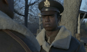Lt. Glen and Cadets Lee, Roberts and Cappy are on a routine training mission when Cappy’s plane begins to experience trouble. Cappy and Lee land on a country road where a prison chain gang are working in a roadside field. As the planes are coming in to land, the prison guards force the prisoners out of the way to make room for the planes to land. The guards are shocked when Lee and Cappy take their flight masks off, revealing themselves as black aviators. The cadets go on to successfully “earn their wings” and are commissioned as 2nd Lieutenants in the Army Air Corps.