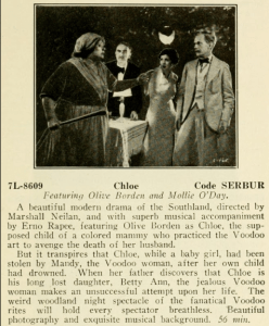 Mandy, a voodoo practicing nursemaid, returns to the swamps of the Everglades with her half-white daughter Chloe and helper, Jim Strong, to exact revenge on Colonel Gordon, the man she believes is responsible for the lynching of her husband Sam fifteen years earlier. The widowed colonel, whose daughter Betty Ann drowned in the swamps around the same time that Sam was killed, lives with his niece Joyce and oversees the family turpentine factory. As Chloe, Mandy and Jim near the colonel’s home, Chloe expresses doubts about her Black heritage and rejects the proposal of the devoted Jim.